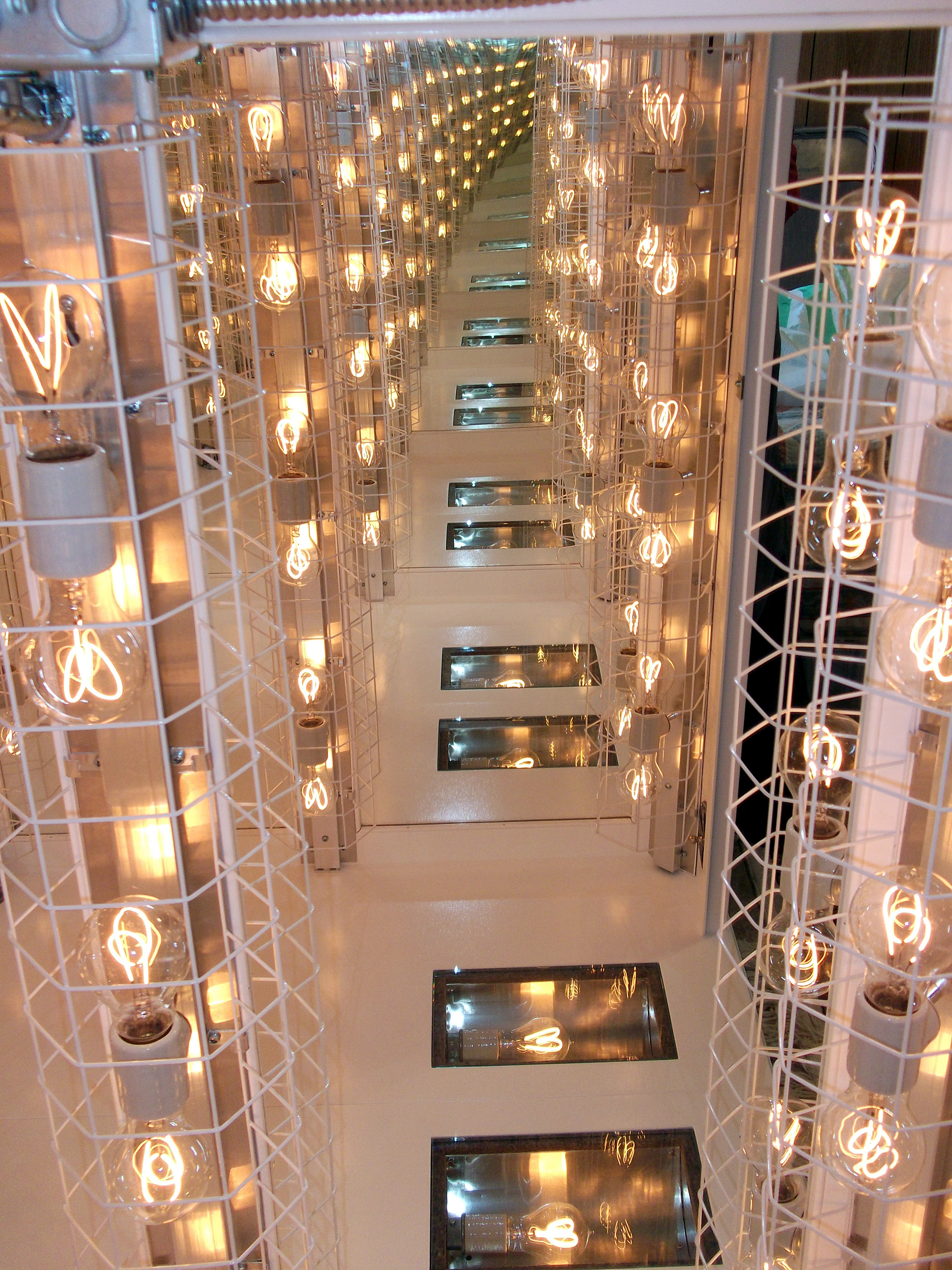 Light Bath interiors were lined with mirrors all the way around, producing the infinity affect. It used 50 Edison incandescent bulbs, including two on the floor. This is my reproduction Light Bath
